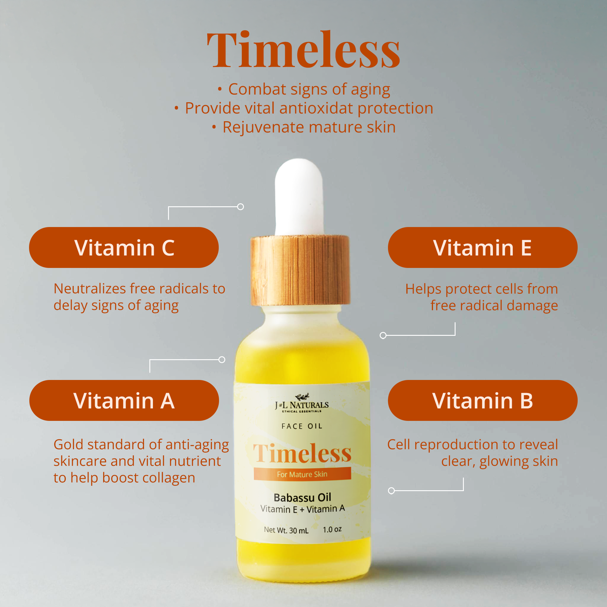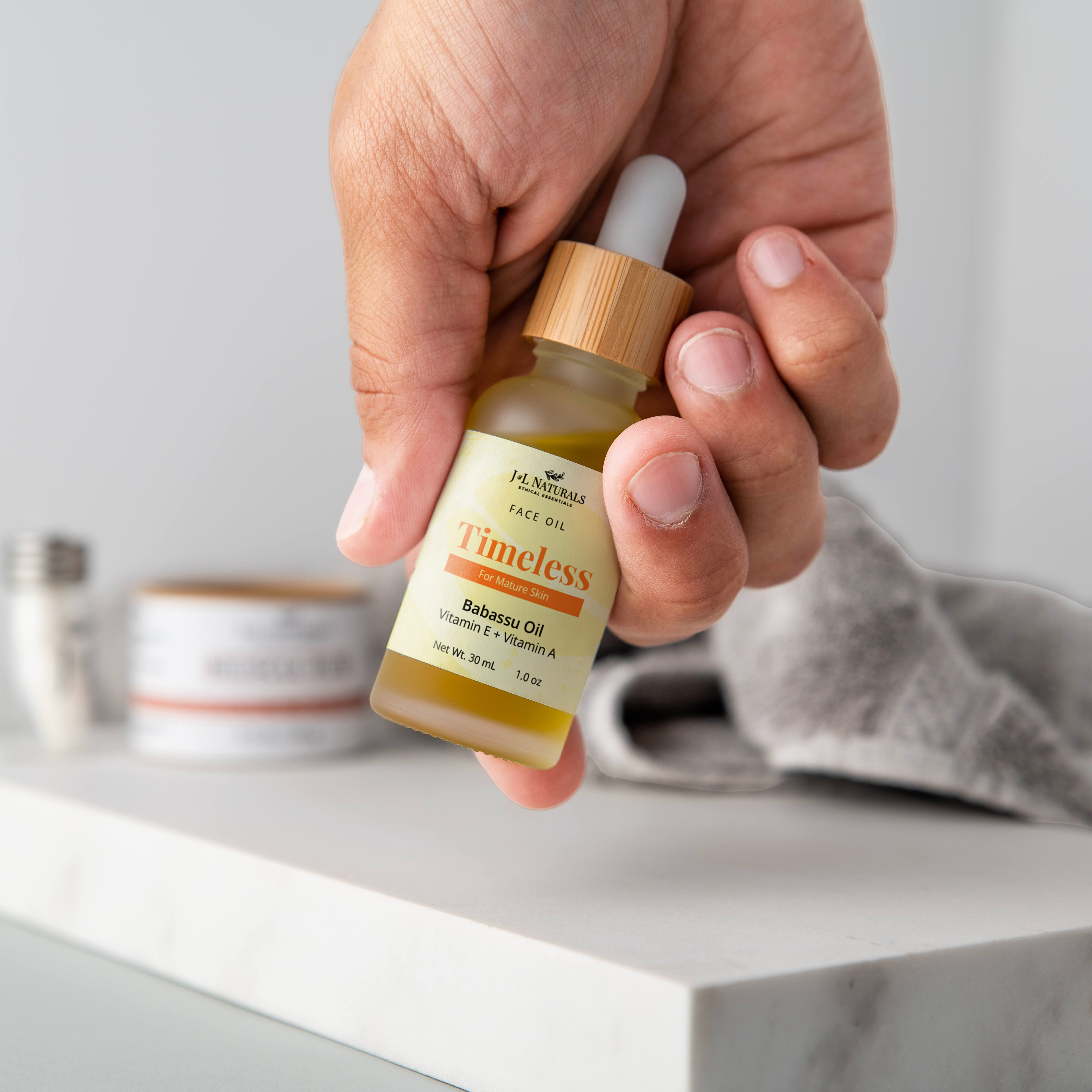 TIMELESS: Sweet Almond Oil, Grapeseed Oil, Babassu Oil, Jojoba Oil, Argan Oil, Rosemary Essential Oil, Ylang Ylang Essential Oil